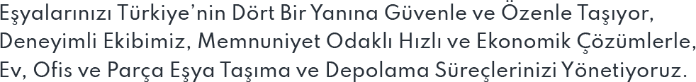 Planlamadan teslimata kadar her aşamada profesyonellik, hız ve güvenle yanınızdayız. Taşınmanın en kolay yolu!